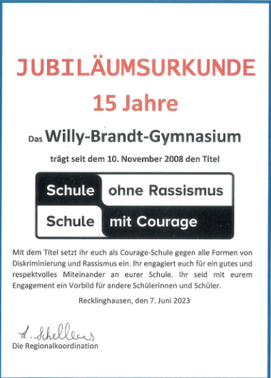 Mit dem Titel „Schule ohne Rassismus – Schule mit Courage“ setzt sich das WBG als Courage-Schule also seit nun 15 Jahren gegen alle Formen von Diskriminierung und Rassismus ein. Wir engagieren uns für ein gutes und respektvolles Miteinander an unserer Schule und wollen damit Vorbild sein.